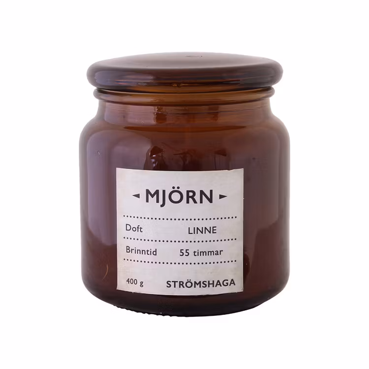 Ett vackert doftljus i en brun glasflaska med lock som doftar härligt av nytvättat linne.