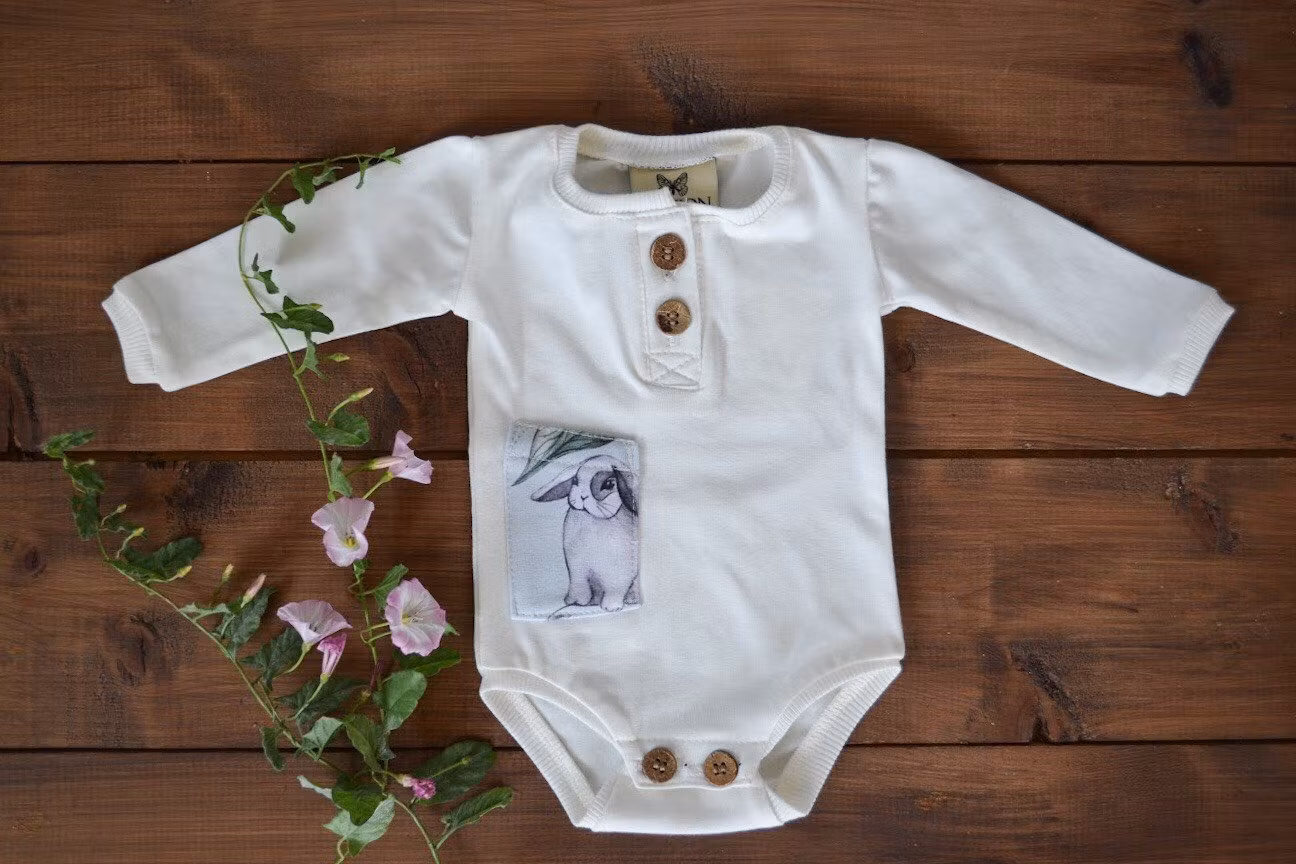 Enfärgad, naturvit body för de allra minsta. Tillverkad i ekologisk bomullstrikå med ribbade muddar i hals och ärm. En ficka på ena sidan av framstycket med mönster av en akvarellmålad liten rabbis. Bodyn har fina träknappar i grenen och mittfram för enkel påklädning.