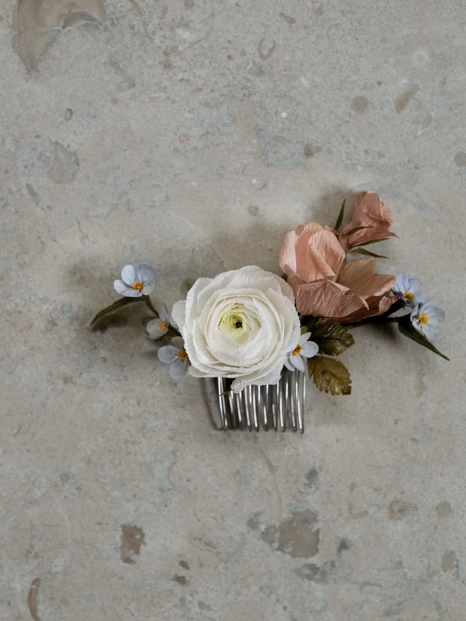 "NÅGOT BLÅTT" har en silverfärgad hårkam som är prydd med; 6 st små Förgätmigej, 1 st vit ranukel, 1 st dovt rosa ros + 1 st rosknopp. "NÅGOT BLÅTT" är unikt och finns endast i ett exemplar. Hårsmycket kommer i en vacker naturfärgad pappersask med guldkant.