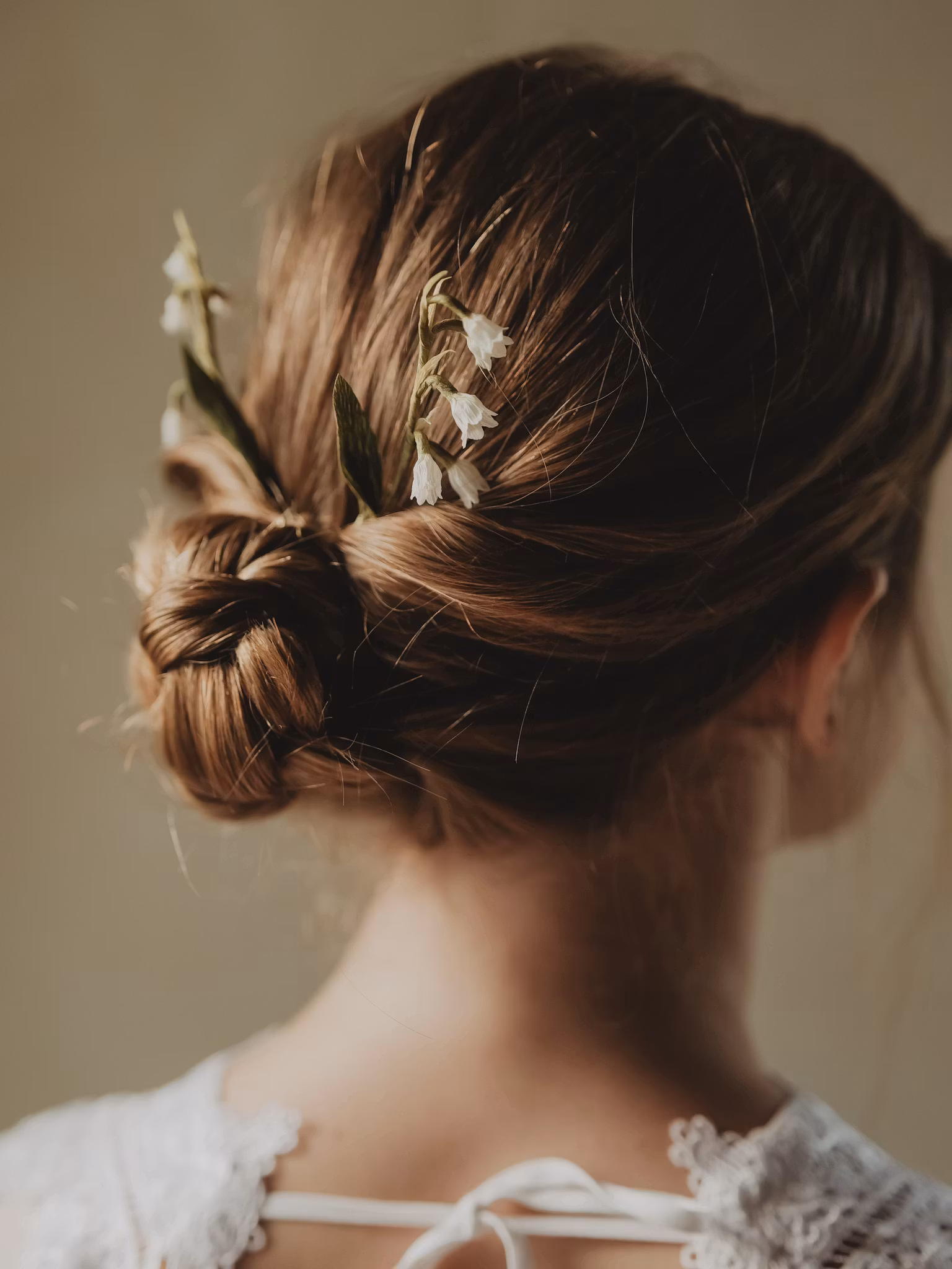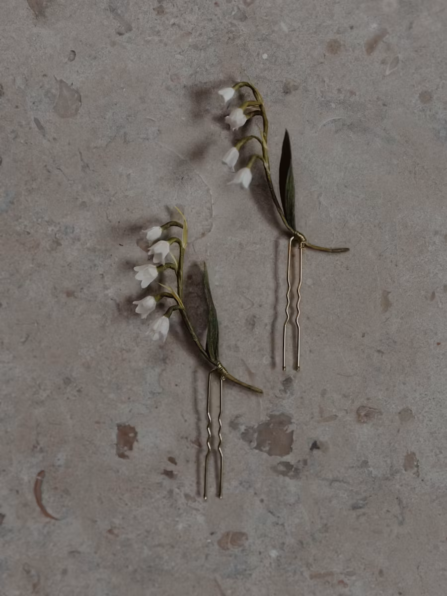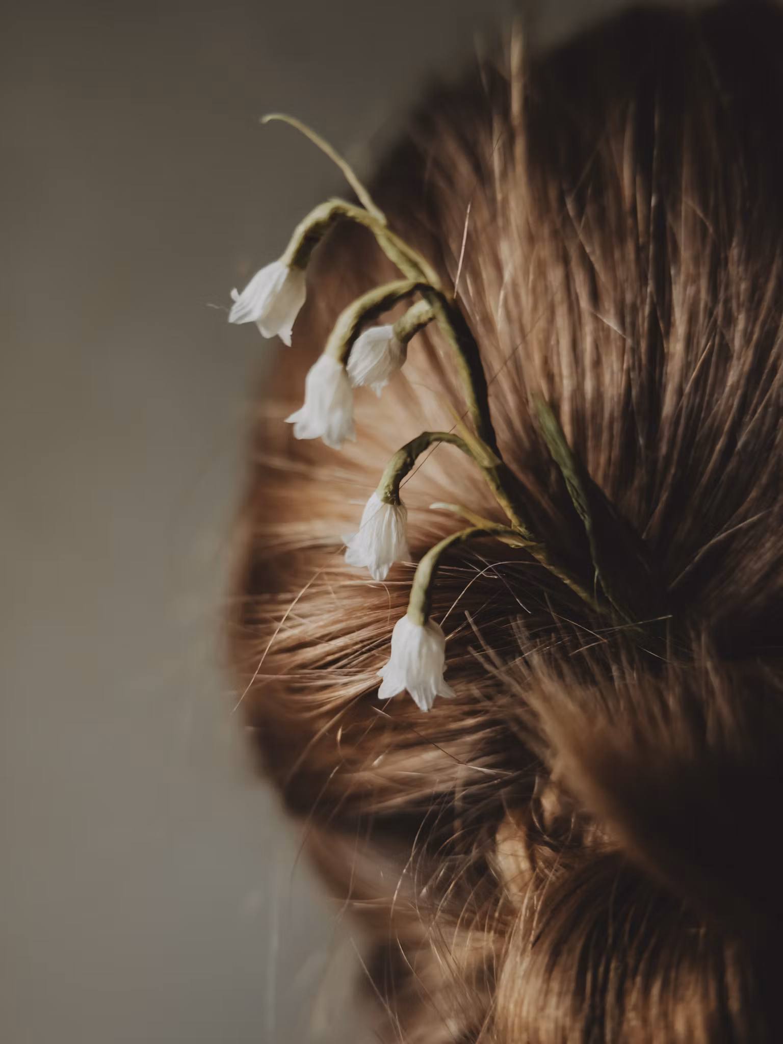 "VÅRVISKNING" har en guldfärgad rejäl hårnål som är prydd med 1 liten liljekonvalj m. 5 blommor. Hårsmycket "VÅRVISKNING" är unikt och finns endast i två exemplar, de är mycket fina tillsammans i uppsättning tex. Hårsmyckena sälja tillsammans och kommer i en vacker naturfärgad pappersask med guldkant.